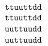 每個字元代表一種語言,並且區域被定義為同一個字元相連的地區。2個字元"相連"指的是該2字元有上、下、左、右四個方向鄰近的關係。所以在上圖中有3個區域說 t 語言,有3個區域說 u 語言,有1個區域說 d 語言。
