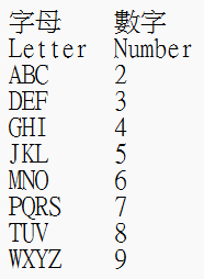 有些地方會用對應的字母來代替數字使得電話號碼更好記。如此一來 MY LOVE 就代表 69 5683。這不是萬靈丹,因為有的電話號碼並不能構成一個字或片語,而且 1 和 0 沒有對應的字母。